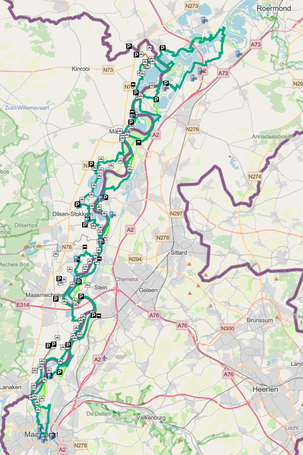 Die 137 Kilometer lange Wanderung im Flusspark Maasvallei beginnt in Maastricht und führt auf der Belgischen Seite nach Uikhoven und weiter nach Norden und von Maasgouw über die Niederländische Seite zurück nach Maastricht.